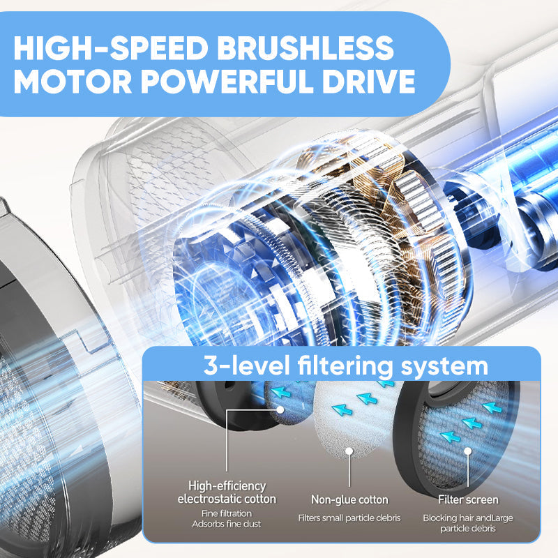 High-speed brushless motor: The Handheld Pet Hair Vacuum features a high-speed brushless motor, delivering powerful suction for effective grooming and cleaning. Its 3-level filtering system ensures thorough filtration, with high-efficiency electrostatic cotton that captures fine dust and debris, and non-glue cotton and a filter screen that block hair and larger particles. This system effectively traps both small dust particles and larger debris, ensuring a cleaner and more hygienic environment for your pet. With its powerful drive and efficient filtration, this vacuum is a must-have for maintaining a clean home and a happy pet.