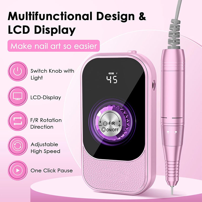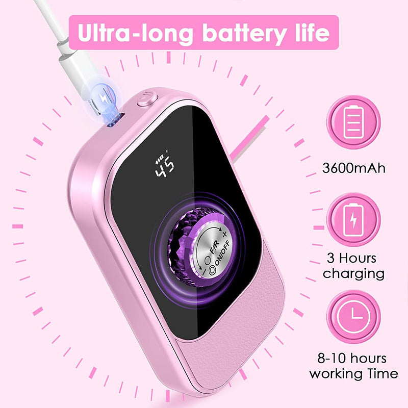 Long-lasting battery life: Equipped with a high-capacity battery, this electric nail file allows you to do nail care anytime, anywhere. After just 3 hours of charging, the rechargeable nail drill operates for up to 8-10 hours, eliminating concerns about low battery levels. The smart lcd screen clearly displays all operating statuses, including speed, rotation direction, battery level, and pause status. Even beginners can use it with ease.