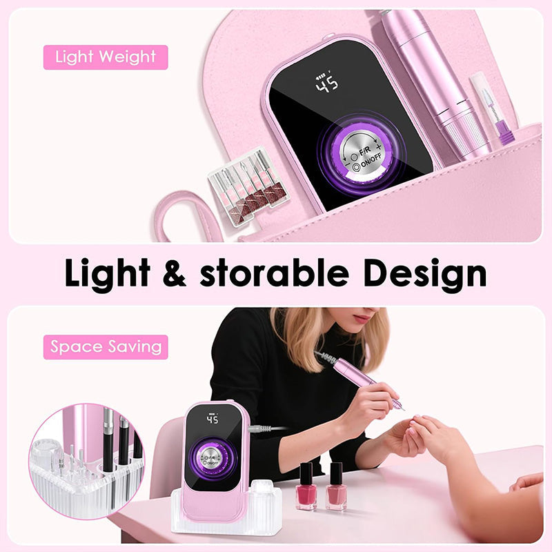 Lightweight & portable: Our portable nail drill is lightweight and compact, easily fitting into your bag for on-the-go nail care. The efile nail drill also comes with a transparent white base, providing storage space for drill bits and nail brushes, keeping your workspace tidy and your desk clutter-free, enhancing nail care efficiency and meeting all your needs.