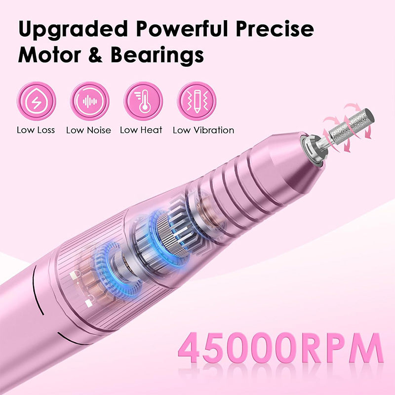 Professional 45,000 rpm nail drill machine: This professional nail drill features an upgraded robust and powerful and durable motor, providing stable current power and speed. Even at an astonishing 45,000 rpm, it ensures smooth and stable operation, offering you a quiet and comfortable nail art experience. It is the ideal choice for beginners, professional nail technicians, and nail art enthusiasts.