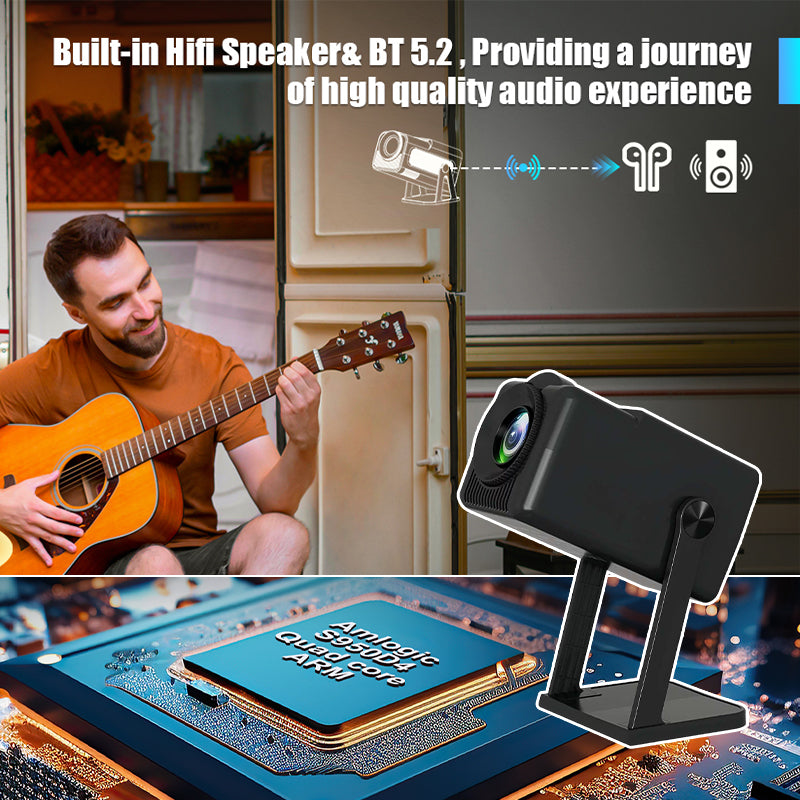 Outdoor movie nights made easy: Enjoy an immersive outdoor movie experience with your family! This compact projector supports multiple connection options and features built-in HiFi speakers with Bluetooth 5.2 for a premium audio journey. Plus, automatic trapezoidal correction allows you to project images on ceilings or walls, even while lying down.