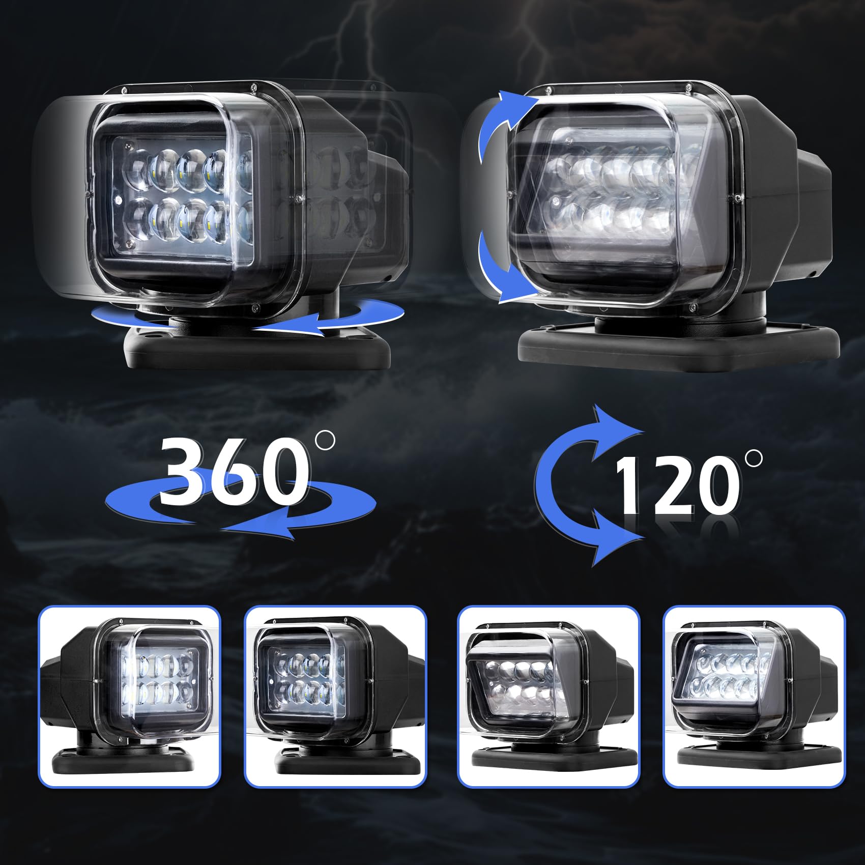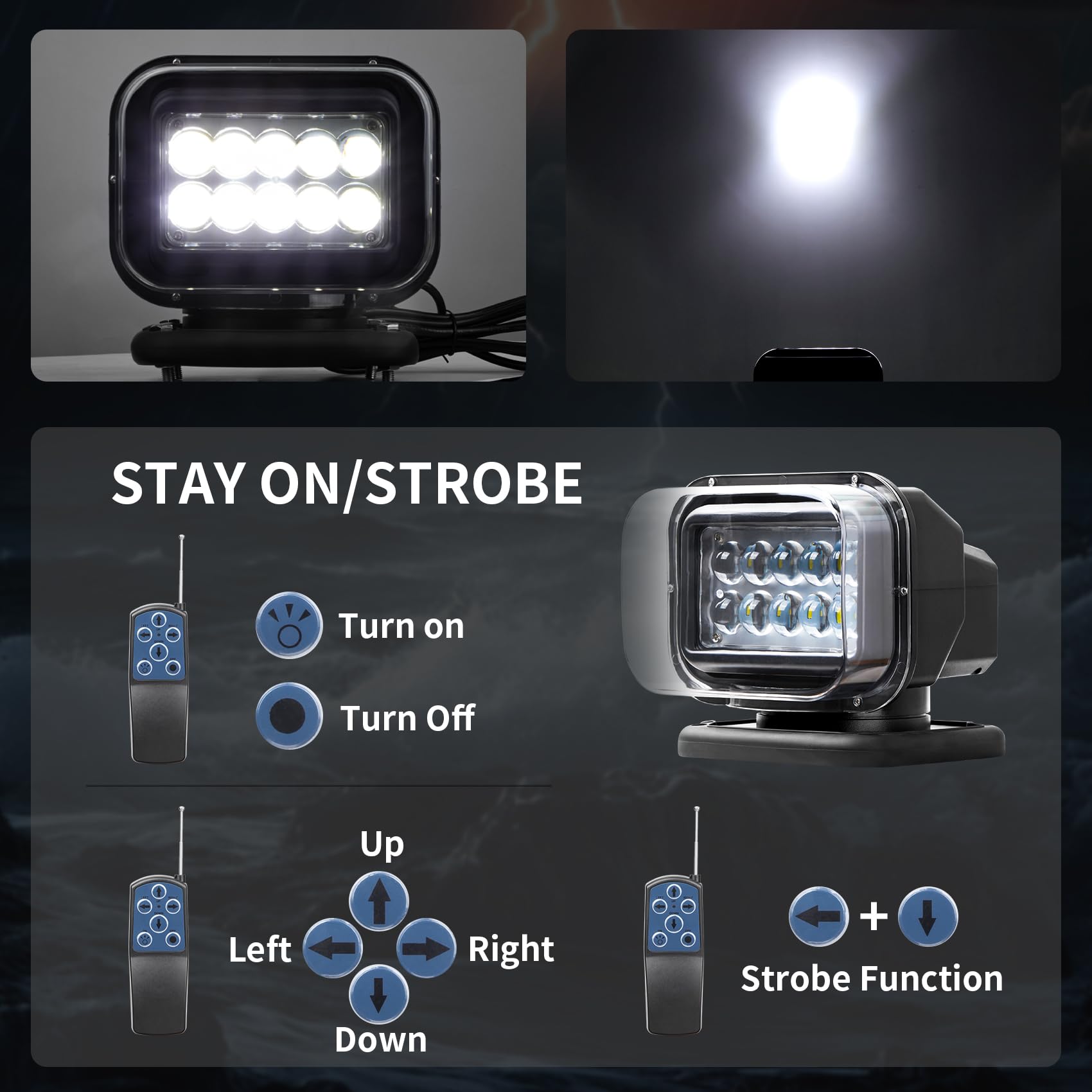 Remote Control: Designed for ultimate convenience and control. With functions like Stay On, Strobe, and precise directional control, this spotlight is perfect for various applications. You can easily Turn On or Turn Off the light with a simple press of a button, and adjust the beam direction with Up, Down, Left, or Right buttons. The Strobe Function offers a powerful flashing mode, ideal for emergency situations or signaling.