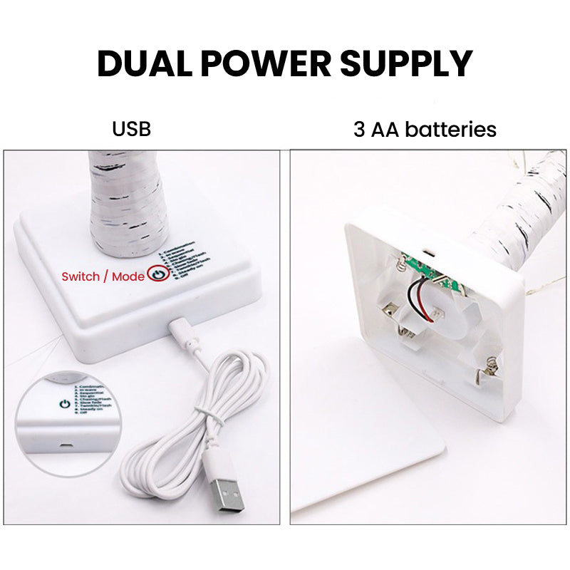 Two power supply options: Christmas Willow Tree Lights are powered by USB/3 AA batteries, you can connect the USB cable (included) to a power source, laptop, USB outlet or adapter and you will be able to see a beautiful glowing willow tree. You can also use 3 AA batteries (not included) to feel the beauty of light. Note: You only need to choose one mode when using it.