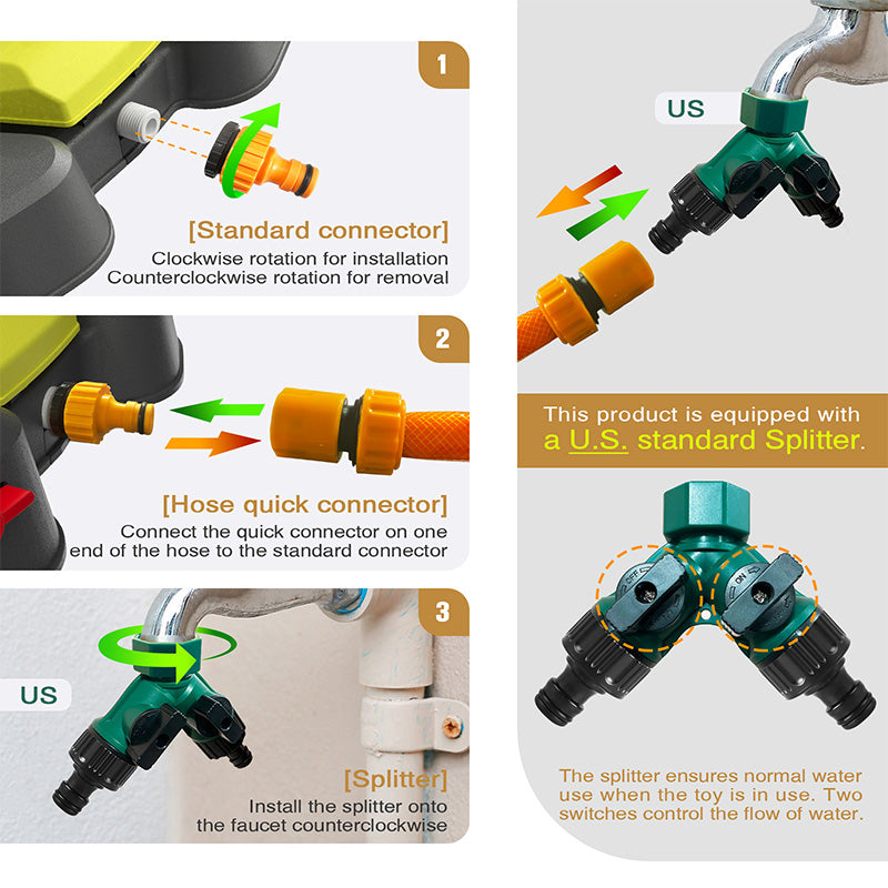Easy and efficient installation: It features a standard connector that attaches to your hose with a simple clockwise rotation and removes counterclockwise. Equipped with a hose quick connector, it allows seamless attachment to the water source. This splitter installs counterclockwise onto the faucet. The splitter ensures a steady water supply even when the toy is in use, with two switches to control water flow independently. This convenient design makes outdoor hydration and play effortless for both pets and owners.