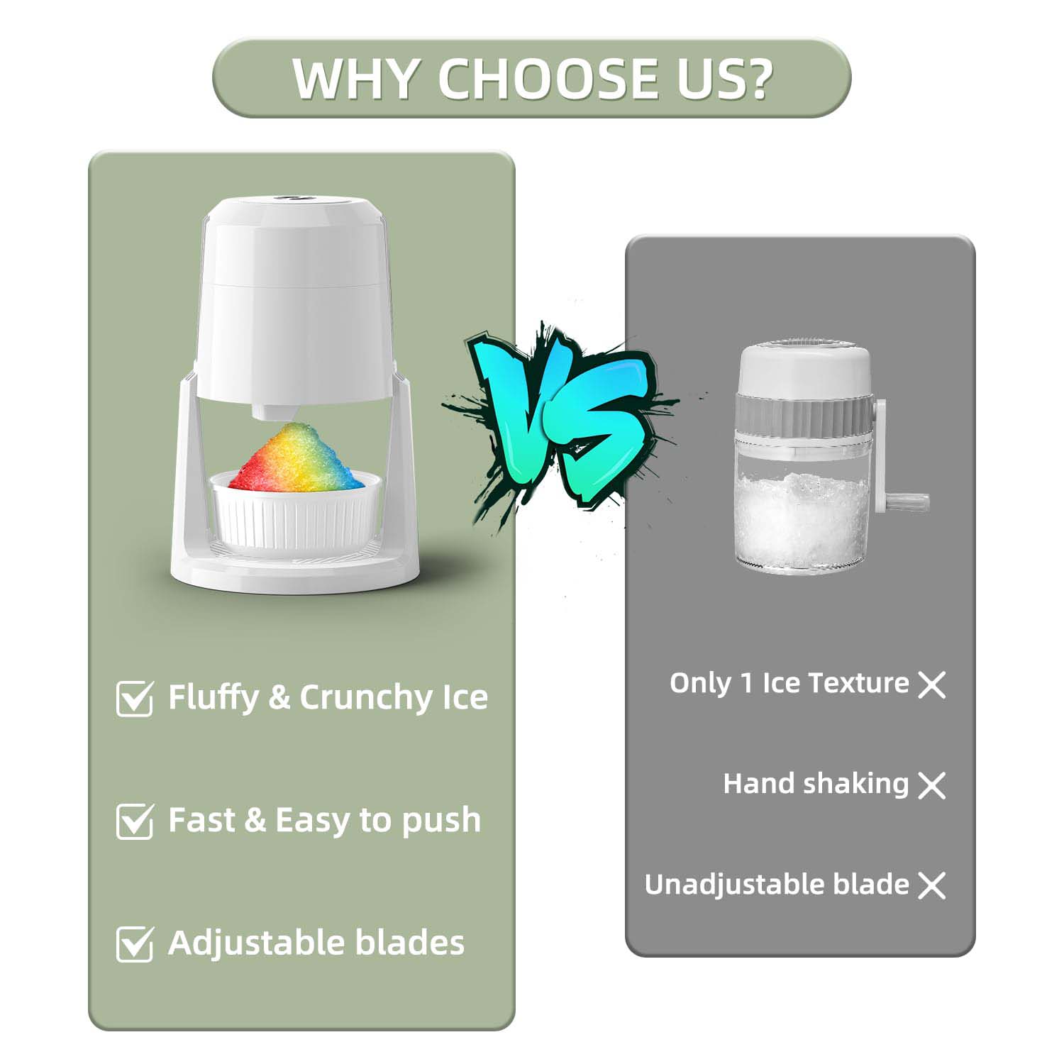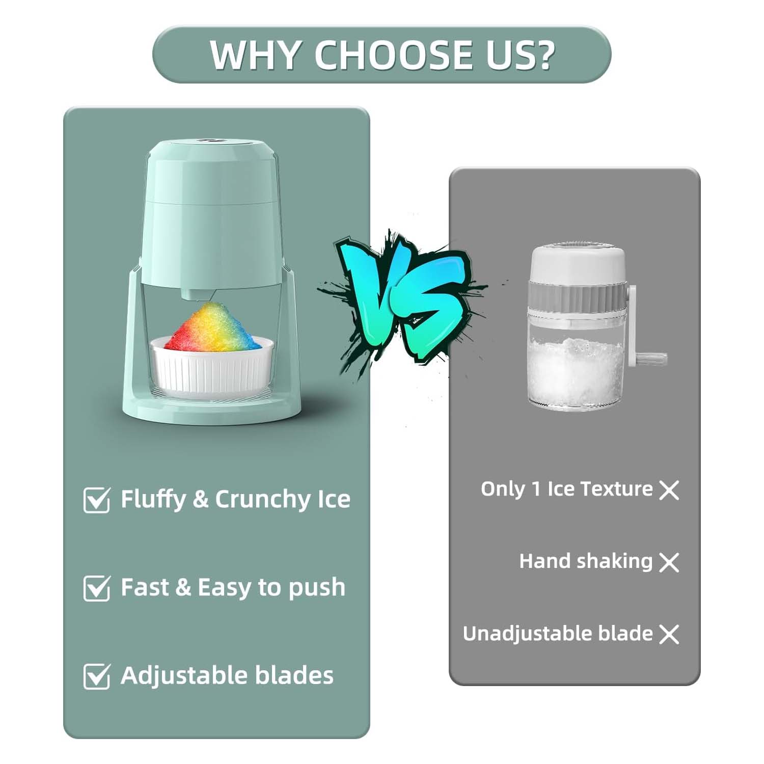 Fluffy or crunchy: Shaved ice machine creates your favorite shaved ice with the adjustable stainless steel blade—choose fluffy for smoothies and slushies or crunchy for margaritas and iced coffee. Snowcone machine includes 2 reusable ice molds for perfectly sized ice, making it ideal for frozen treats like granita, snow cones, and more!