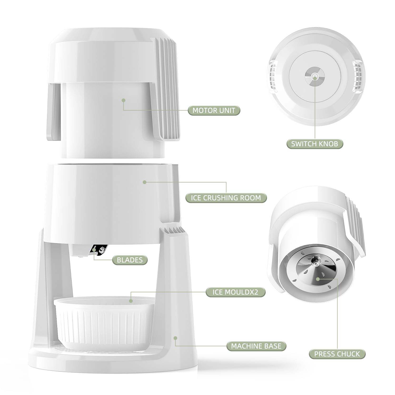 Smart design: Every part of this ice shaver is crafted for smooth operation and long-lasting performance: Blades, Motor Unit, Ice Crushing Room, Ice Mould ×2, Switch Knob , Machine Base, Press Chuck.