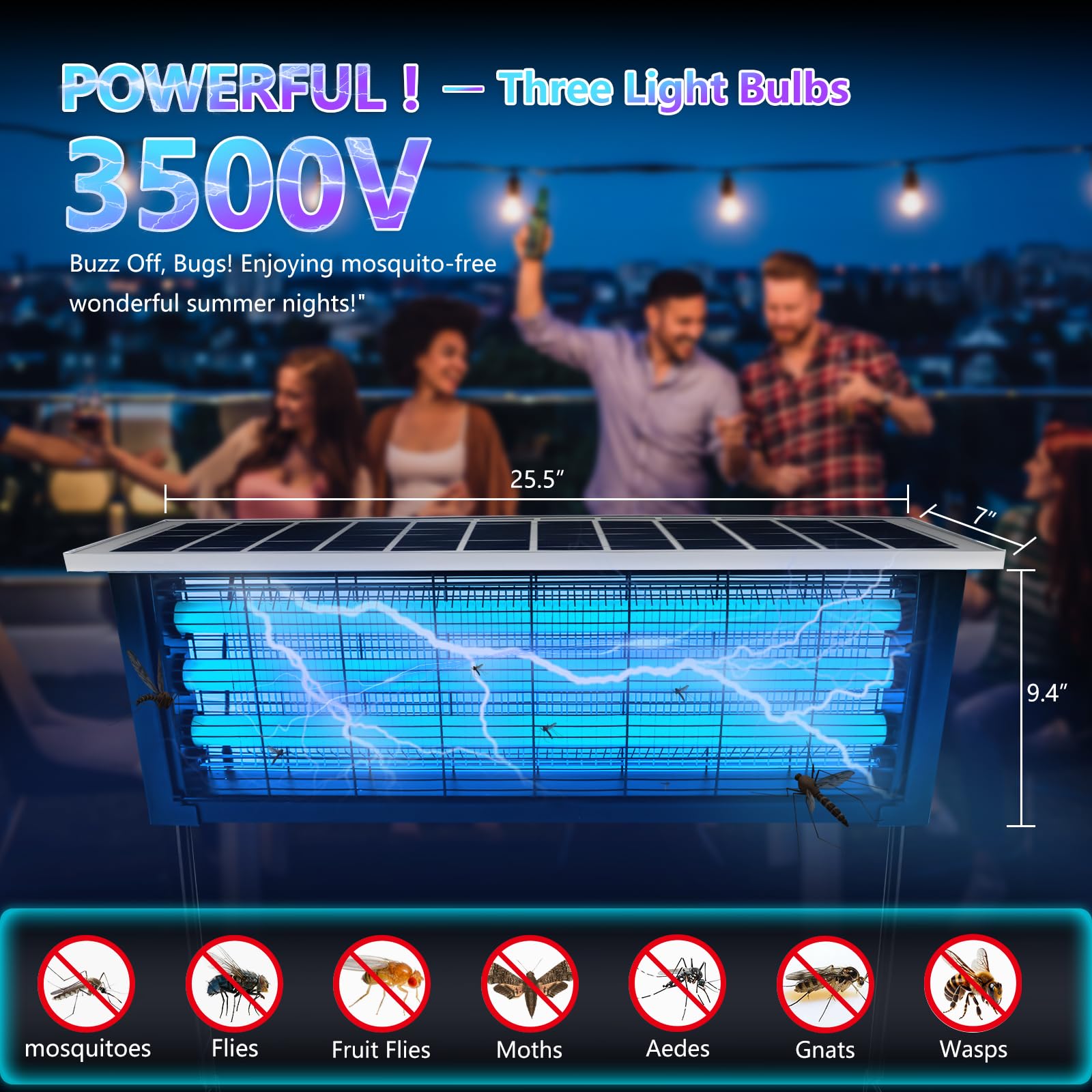 Powerful protection: Equipped with three high-intensity UV bulbs and a 3500V electric grid, this bug zapper delivers serious mosquito-fighting power. Say goodbye to buzzing pests and hello to mosquito-free summer nights. Whether you're relaxing in your garden, hosting a barbecue, or camping under the stars, this zapper keeps your space bug-free and peaceful.