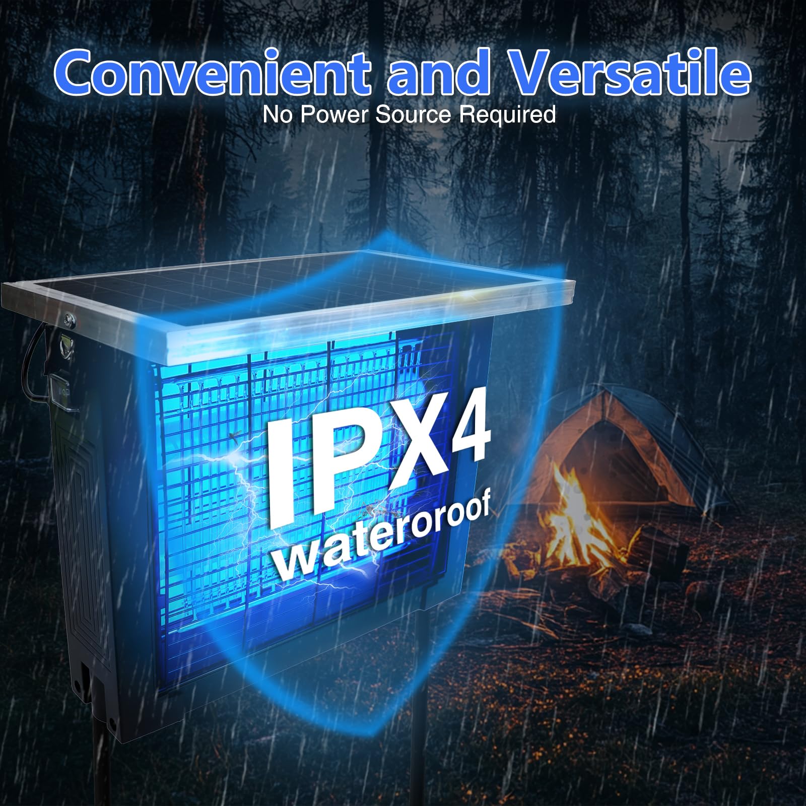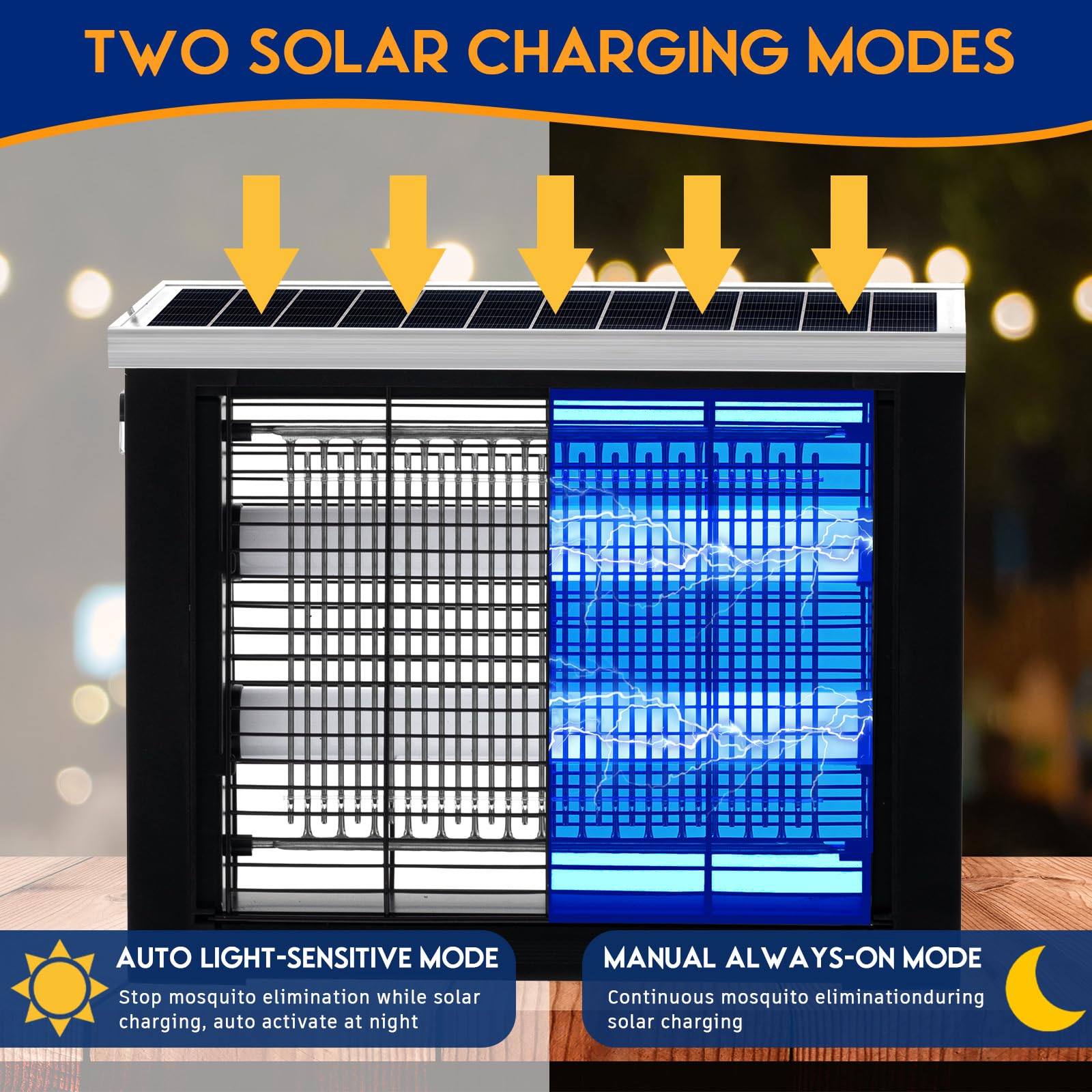 Two smart solar charging modes: This bug zapper offers two solar charging modes to meet different needs. In Auto Light-Sensitive Mode, it pauses mosquito elimination during the day while charging via solar power, then automatically activates at night. Prefer round-the-clock protection? Switch to Manual Always-On Mode for continuous mosquito elimination even while solar charging.