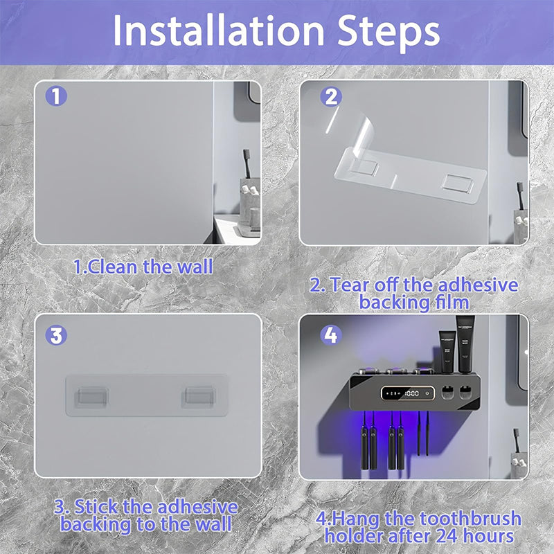 Easy no-drill installation: This wall-mounted toothbrush holder requires no drilling. Simply wipe the smooth surface clean, let it dry completely, apply the traceless adhesive pad, and wait 24 hours before hanging the holder. This toothpaste dispenser kit keeps your bathroom neat and well-organized.