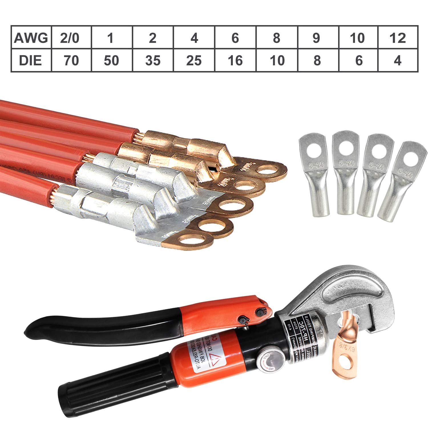 Compatibility: Crimps 12 AWG to 2/0 AWG size copper and aluminum wires. Maximum crimping power: 10 tons. Crimping Stroke : 12mm. The hydraulic crimper's head can be rotated 180° freely to benefit narrow space working, a good choice for battery and welding cables, power wires, electrical cables, etc. On/Off control for fast operation, easy crimping and arm retraction when crimping aluminum or copper wire.