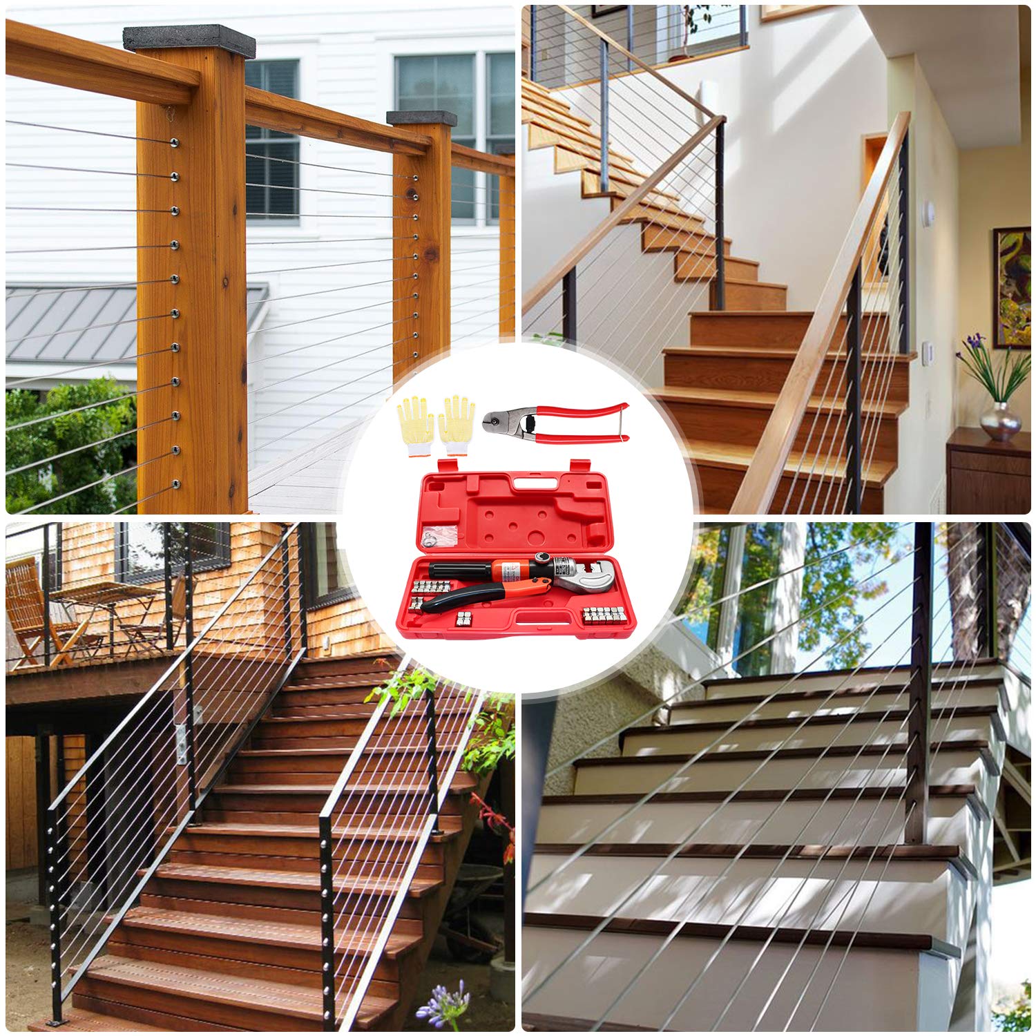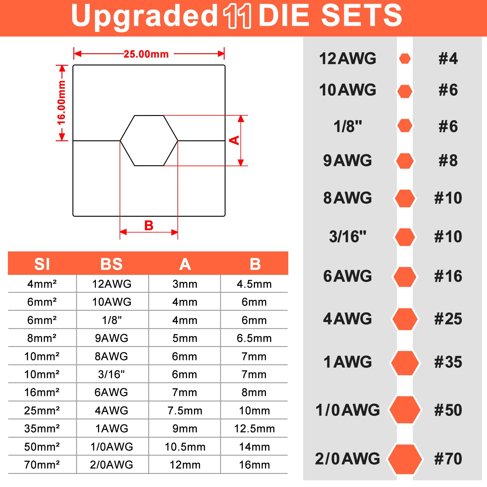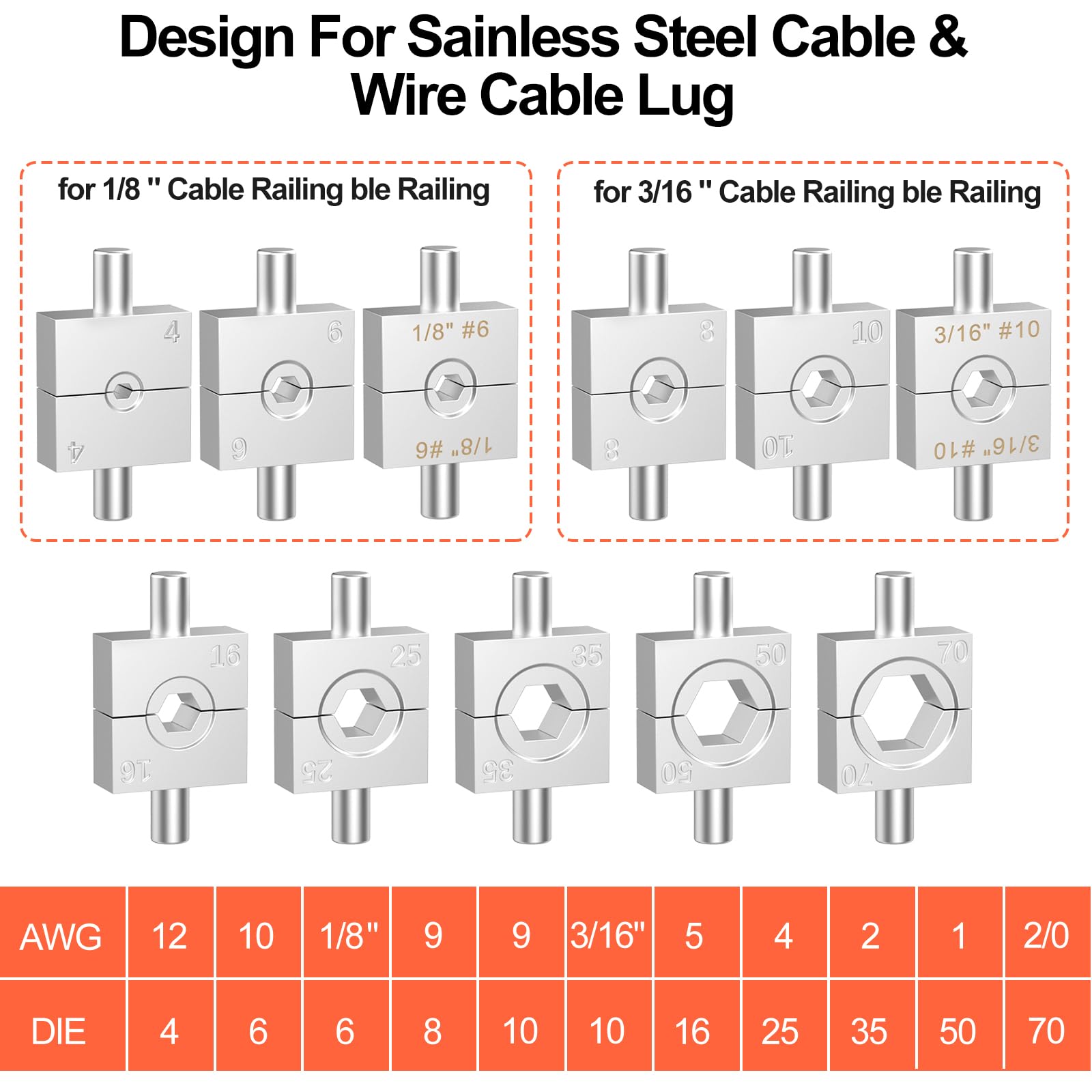 Dies Size: Comes with crimping dies for 12 AWG, 10 AWG, 9 AWG, 8 AWG, 6 AWG, 4 AWG, 2 AWG, 1 AWG and 2/0 AWG cables and creates strong, hexagonal crimps for a clean, efficient look for your projects. Customized for swaging 1/8 inch(4 mm Die) or 3/16 inch (8 mm or 10 mm Die) fittings onto 1/8 Inch or 3/16 Inch stainless steel cable.