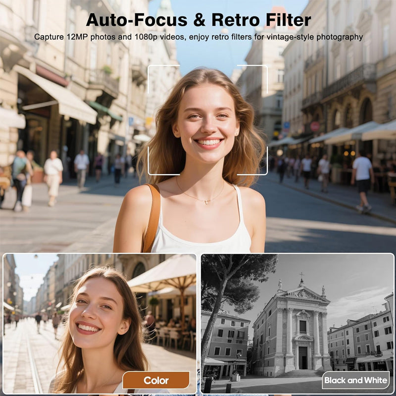 Auto focus & effortlessly capture the moment: This retro digital camera has autofocus and can easily capture FHD 1080P videos and 12-megapixel retro photos. There is no need to manually adjust colors, brightness or complicated settings. Just press the shutter to capture precious moments, making shooting simple and fun! It can also capture photos in different retro styles, such as color or black and white