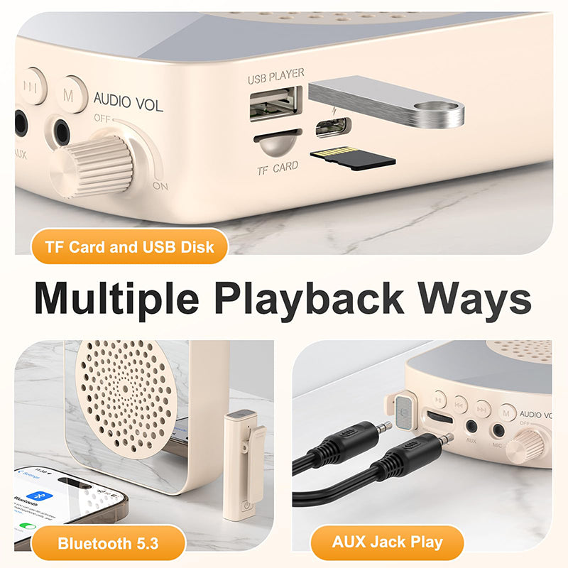 Multiple playback options: Supports Bluetooth 5.3, TF card, USB disk, and AUX for versatile media input.