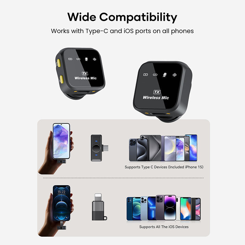 Wide compatibility: The upgraded wireless microphones are compatible for iPhone, iPad, Android phones, as well as Windows and Mac computers (includes adapters for iOS and TYPE-C ports). Suitable for video recording, podcasts, vlogs, TikTok, YouTube, Instagram, Facebook, and more.
