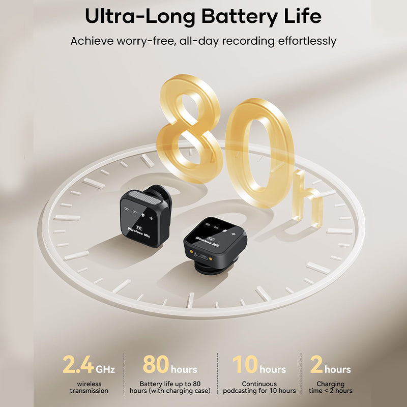 Up to 80 hours of battery life: The wireless mic comes with a 1200mAh rechargeable case for easy storage. It only takes 2 hours to fully charge the podcast microphone, with a working time of up to 10 hours. With the charging case, the entire set can be charged 4 times, extending the battery life up to 80 hours. Perfect for long outdoor recordings, podcasts, and live streams. Additionally, the microphone can charge your phone while in use.